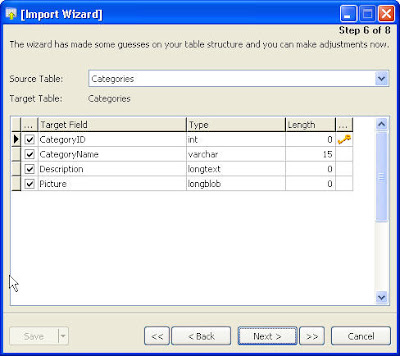 4.เลือกฐานข้อมูล northwind.mdb เข้ามา จะเห็นว่ามันจะแสดง table ทั้งหมดในฐานข้อมูลมาให้เราดู เราก็คลิกปุ่ม Select All แล้วคลิก Next